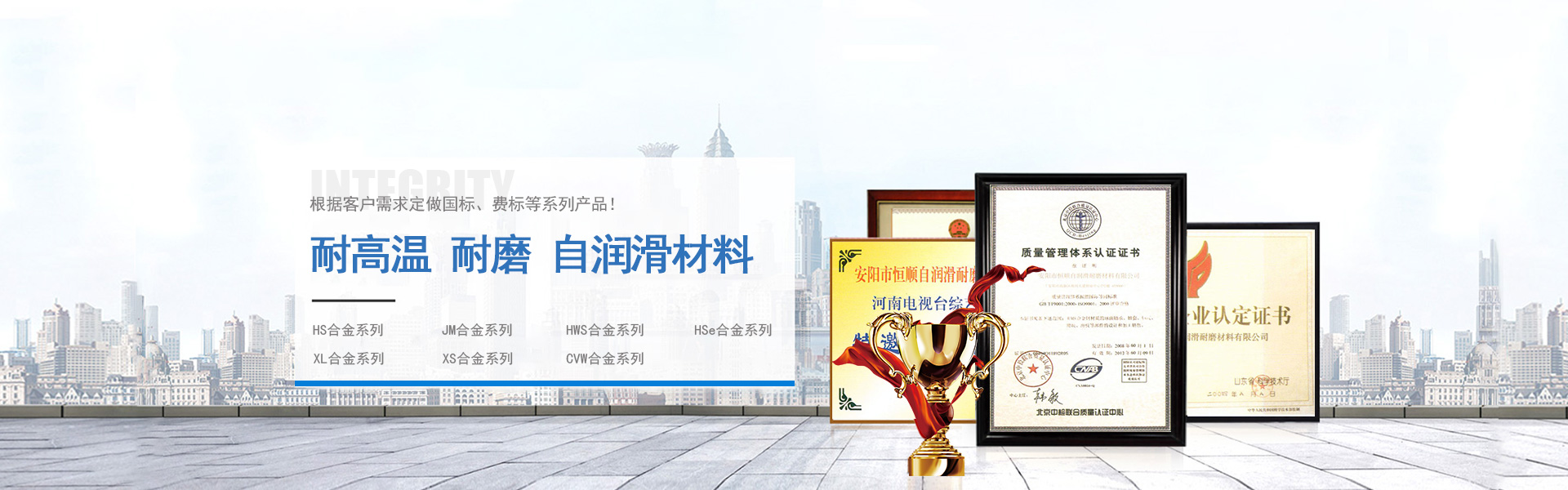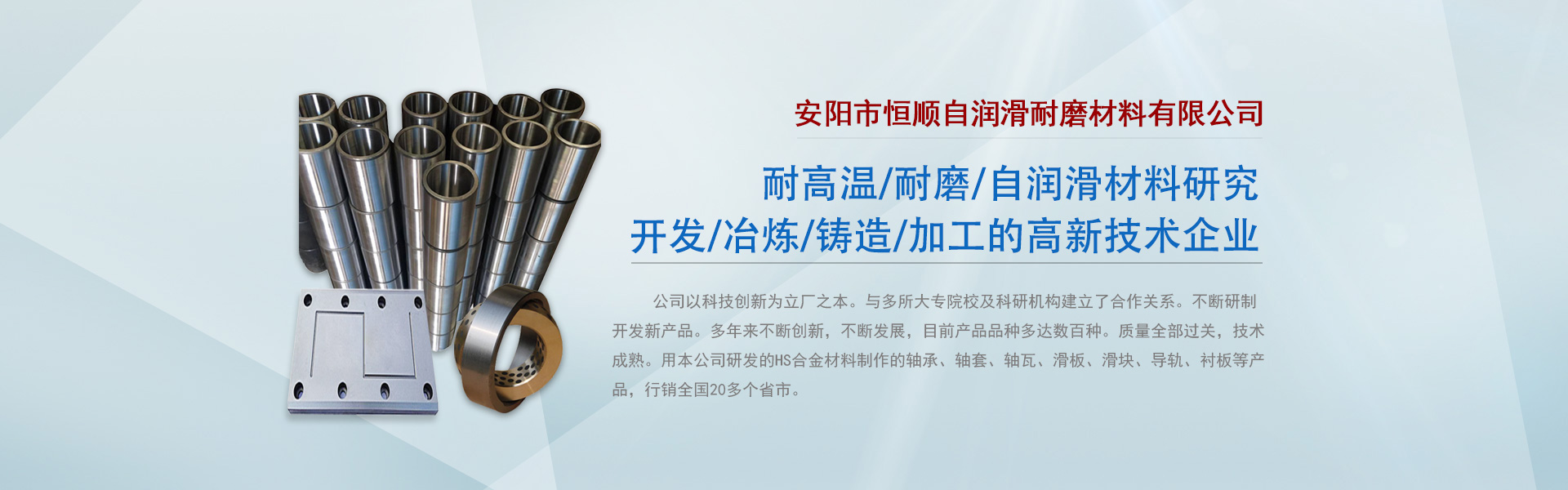 用心(j)研发生· 专门从事耐高温、耐磨、自润滑材料研究安阳?jng)恒润滑耐磨材料有限公司Q是专门从事高硫合金轴承,高温耐磨轴承,自润滑u承等耐高温,耐磨Q自润滑材料产品研究、开发、冶点{铸造、加工的高新技术企业?br/> 公司以科技创新为立厂之本。与多所大专院校?qing)科研机构徏立?jin)合作关系。不断研制开发新产品。多q来不断创新Q不断发展,目前产品品种多达数百U。质量过养I技术成熟。用本公司研发的HS合金材料制作的uѝu套、u瓦、滑ѝ滑块、导轨、衬板等产品Q行销20多个省市(jng)。适用范围遍及(qing)冉、徏材、矿山、机械制造、发动机械、阀门配件、石沏V化工、hl、煤矿的行业。特别在高温、多、重载、缺沏V维修不便,q箋(hu)作业{恶劣环境条件下使用h显著的效?..